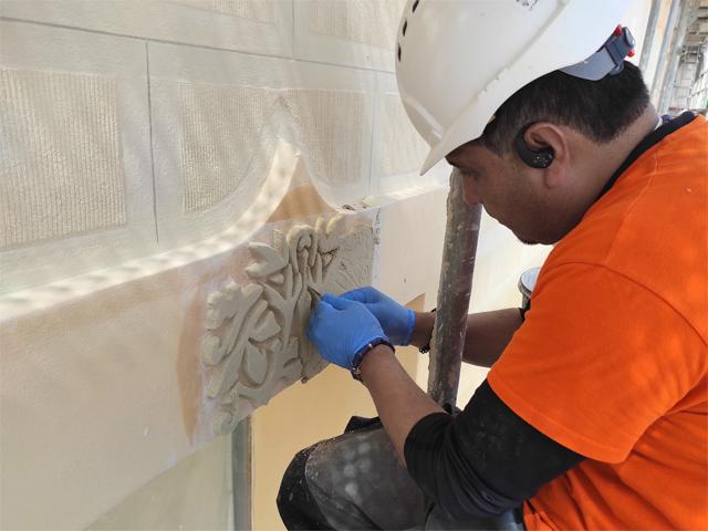 - Formació de nous esgrafiats amb tècniques de restauració, amb morter de calç tradicional, en emmarcaments de finestres.